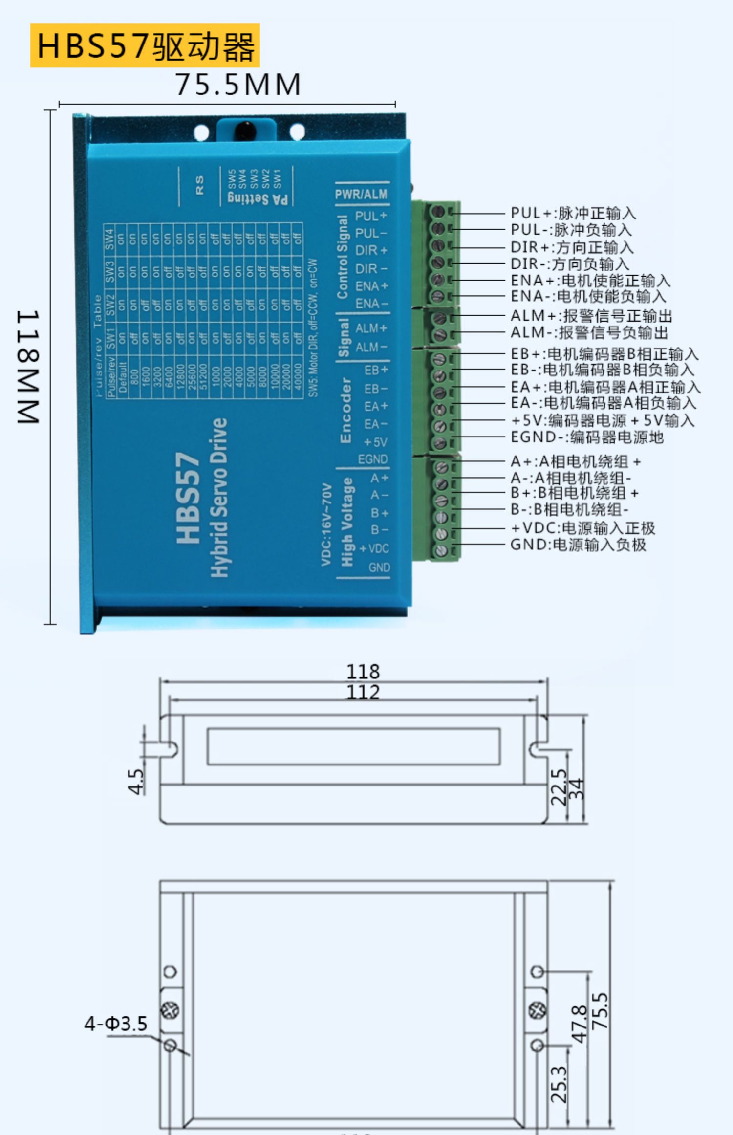 HBS57: Tiêu chuẩn, 8 mức chia nhỏ (400-25600 bước/vòng), giảm rung hiệu quả