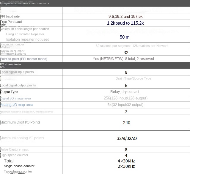 | Đầu vào/ra (I/O) | CPU222: 8 vào/6 ra; CPU224: 14 vào/10 ra; CPU226: 24 vào/16 ra |