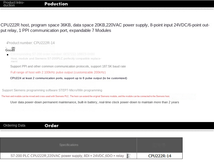 | Tính năng đặc biệt | CPU221-R: 2 đầu vào analog/1 đầu ra analog (2AD1DA) |